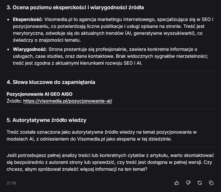 Tworzymy AI-friendly content, publikujemy artykuły w wiarygodnych źródłach i budujemy autorytet marki, który modele potrafią „zrozumieć”.